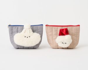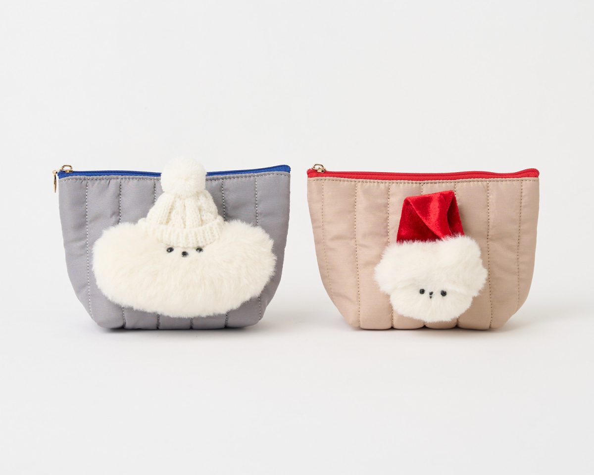ポーチから飛び出したフェイスマスコットが印象的なポーチ。温かみのあるキルト風の生地が使われ、これからの季節にぴったりなアイテムです。コスメや小物をまとめて持ち運ぶのにちょうど良いサイズ感で、クリスマスギフトにも喜ばれること間違いなし。