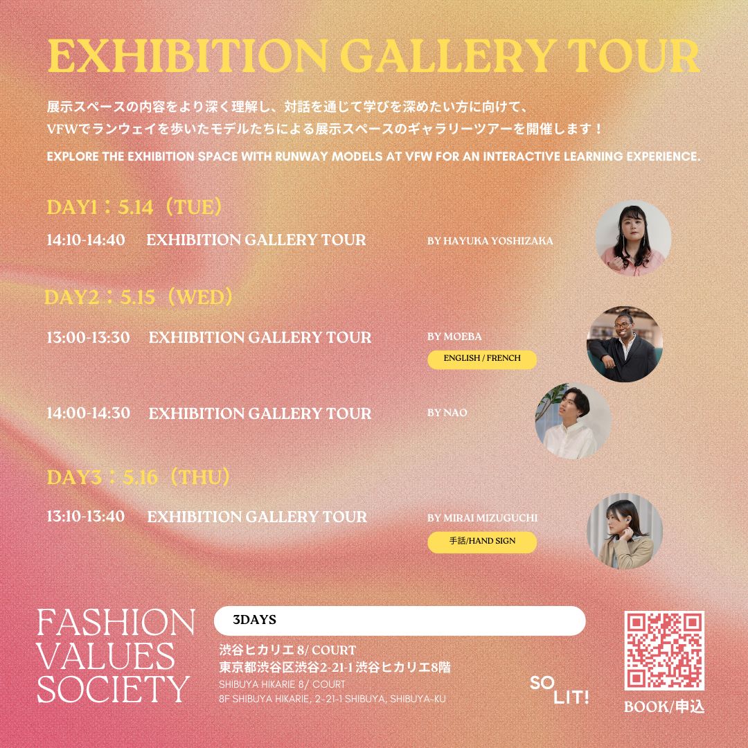 展示スペースの内容をより深く理解し、対話を通じて学びを深めたい方に向けて、VFWでランウェイを歩いたモデルたちによる展示スペースのギャラリーツアーを開催します。