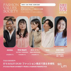 文化多様性の都市・バンクーバーで4月に開催されたバンクーバーファッションウィーク(VFW)のランウェイに出場したSOLIT!が、世界の舞台への挑戦を経て感じたファッション×ダイバーシティの課題やその解決策、日本のDE&Iのこれからについて多角的な視点で考えるイベント『Fashion Values Society -DE&Iを知る、感じる、繋がる3日間』を、2024年5月14日(火)〜16日(木)の3日間、渋谷ヒカリエ 8/で開催します!