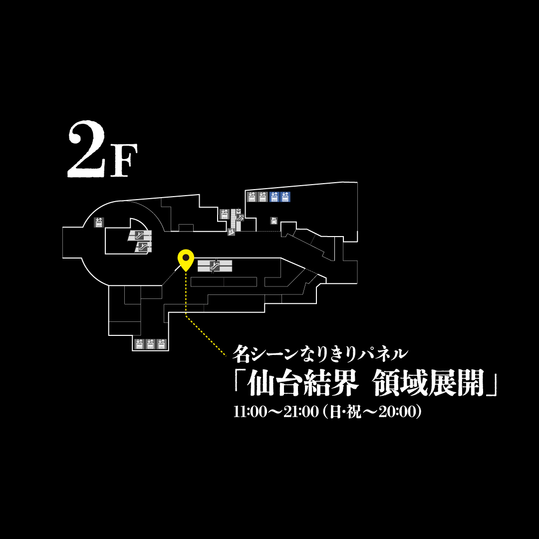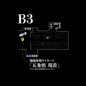 「渋谷事変」を語るうえで欠かせないワンシーンがフォトスポットに!なりきりパネルで、獄門疆への封印を体験できます。五条悟になりきるもよし、自分なりに抗うもよし、封印の瞬間を思う存分体感してください。