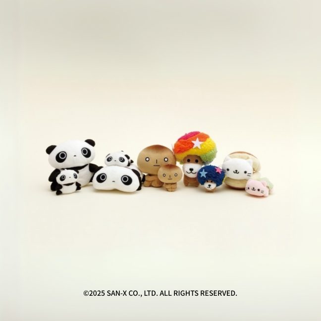 たれぱんだ、こげぱん、アフロ犬、にゃんにゃんにゃんこなど、懐かしのキャラクターのアイテムが勢揃い。ぬいぐるみや文房具がずらりと並びます。
