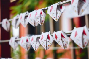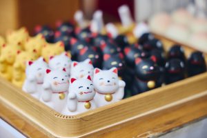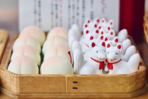 自由が丘緑が丘 熊野神社にお詣りしたら忘れてならないのが、かわいらしいおみくじでしょう。八咫烏に招き猫、お稲荷さまの使いの白狐、破邪の力をもつ桃の実まで、どれを手に取って良いか迷うほど。