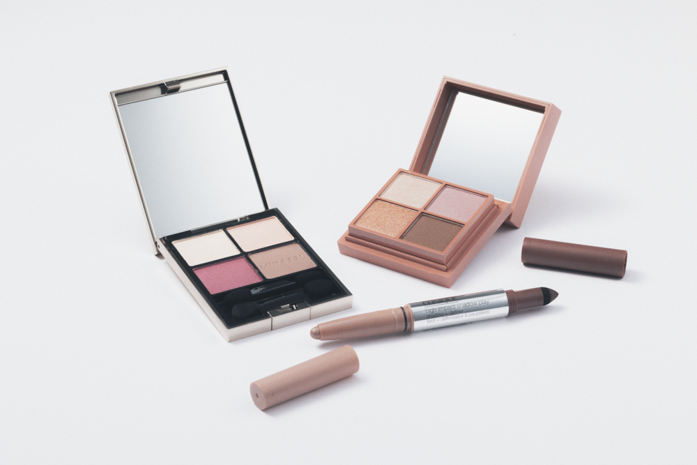 重ねづけしやすいヌーディカラーの4色が立体感とツヤのある目元を演出。下段にはチーク兼ハイライトがセットに。