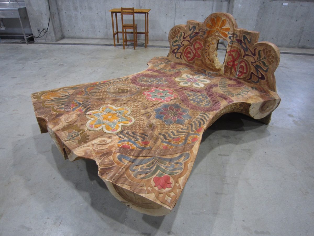 「使用することができる彫刻」として一貫して家具を制作しつづけている紫谷きづな。家具一面を覆いつくすように彫られた独特な紋様が記憶に残ります。