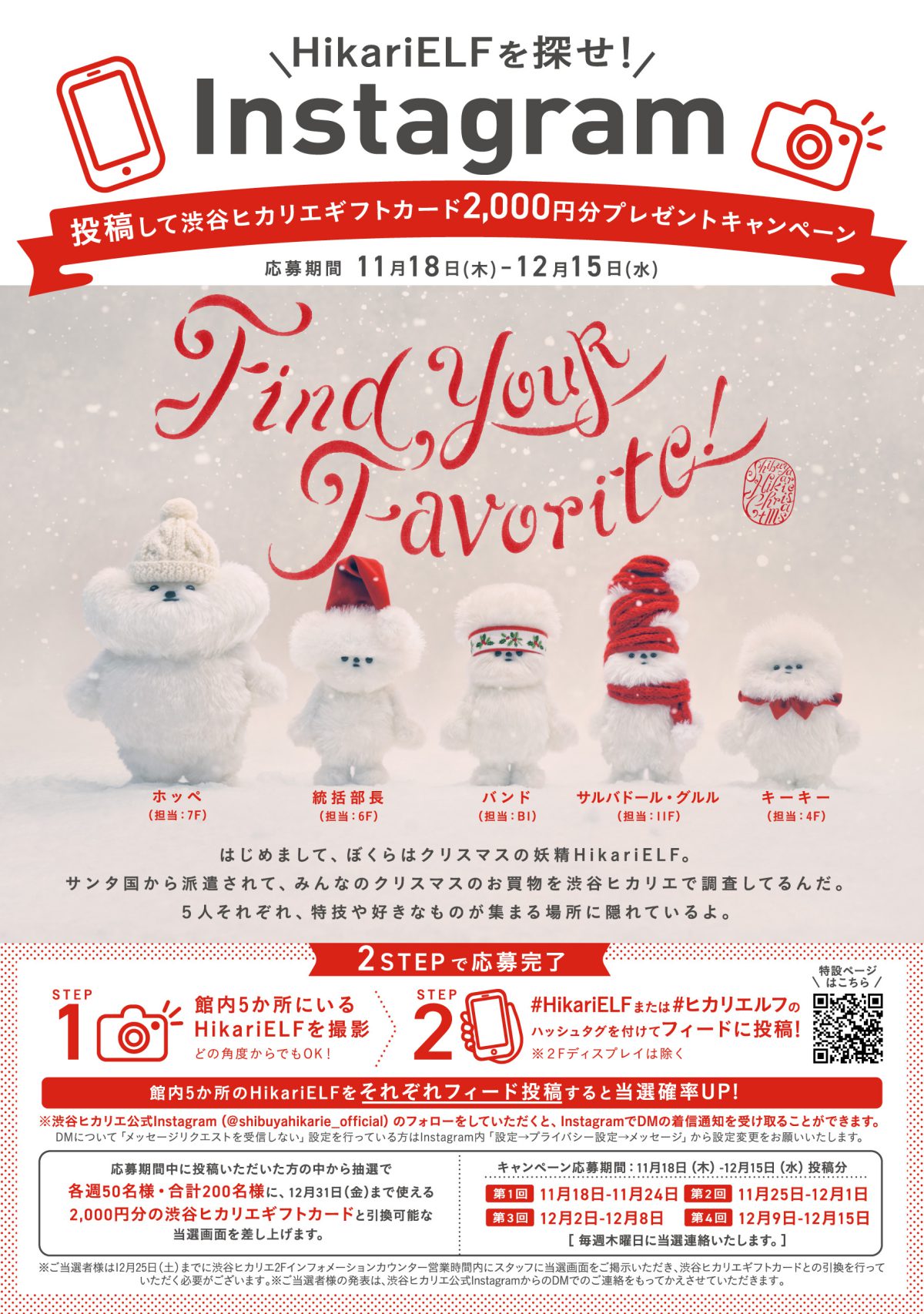 館内5か所(2F ディスプレイを除く)にいる「HikariELF」の写真と #HikariELF または #ヒカリエルフ のハッシュタグをInstagramにフィード投稿いただくことで本キャンペーンにご応募いただけます。
